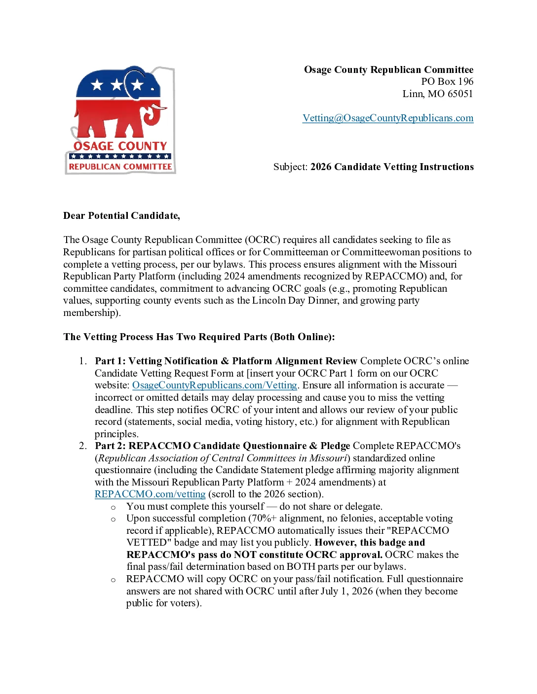 This official 2026 Vetting Letter and Instructions from the Osage County Republican Central Committee (OCRC) outlines the mandatory two-part vetting process for all potential Republican candidates in Osage County.
