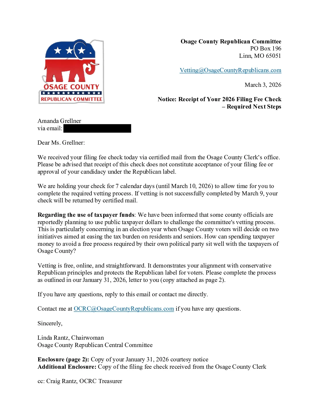 Letter sent to Amanda Grellner on March 3, 2026, confirming receipt of her filing fee check from the clerk. Receipt of the check does not mean acceptance by the committee. The check is being held for 7 days (until March 10) to allow time for vetting. If vetting is not completed, the check will be returned. The letter included a copy of the initial letter mailed to her on January 31, 2026, explaining the vetting process and how filing fees could be paid to the treasurer.
