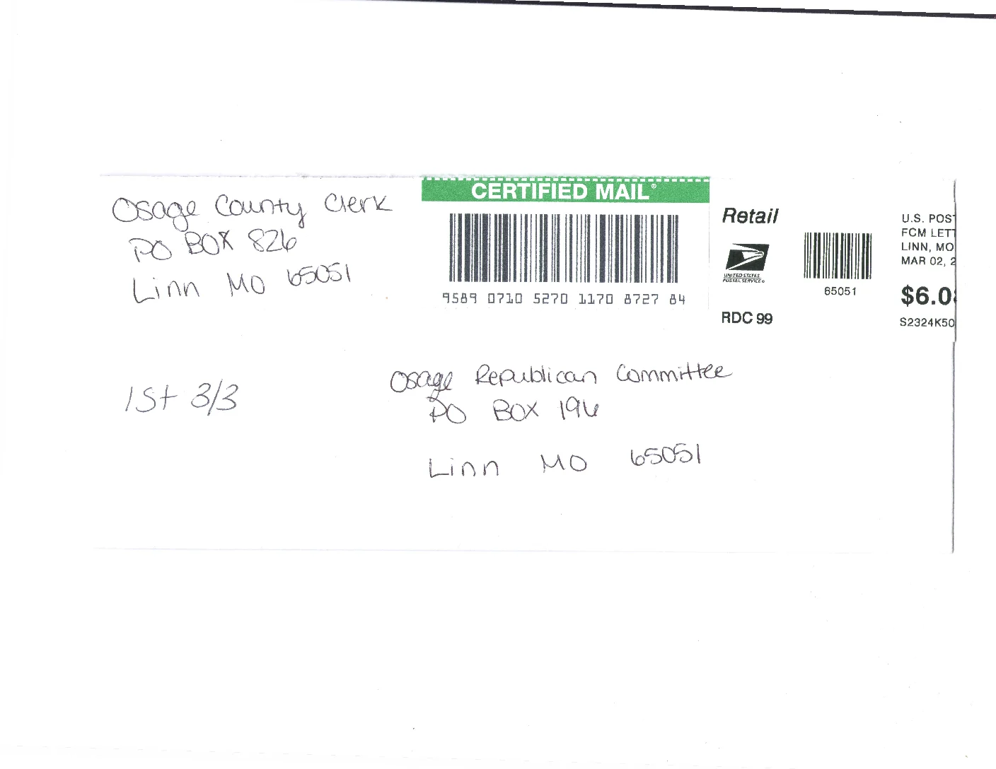 This PDF is a copy of the handwritten envelope received from the Osage County Clerk’s office on March 3, 2026, via certified mail. Key details: