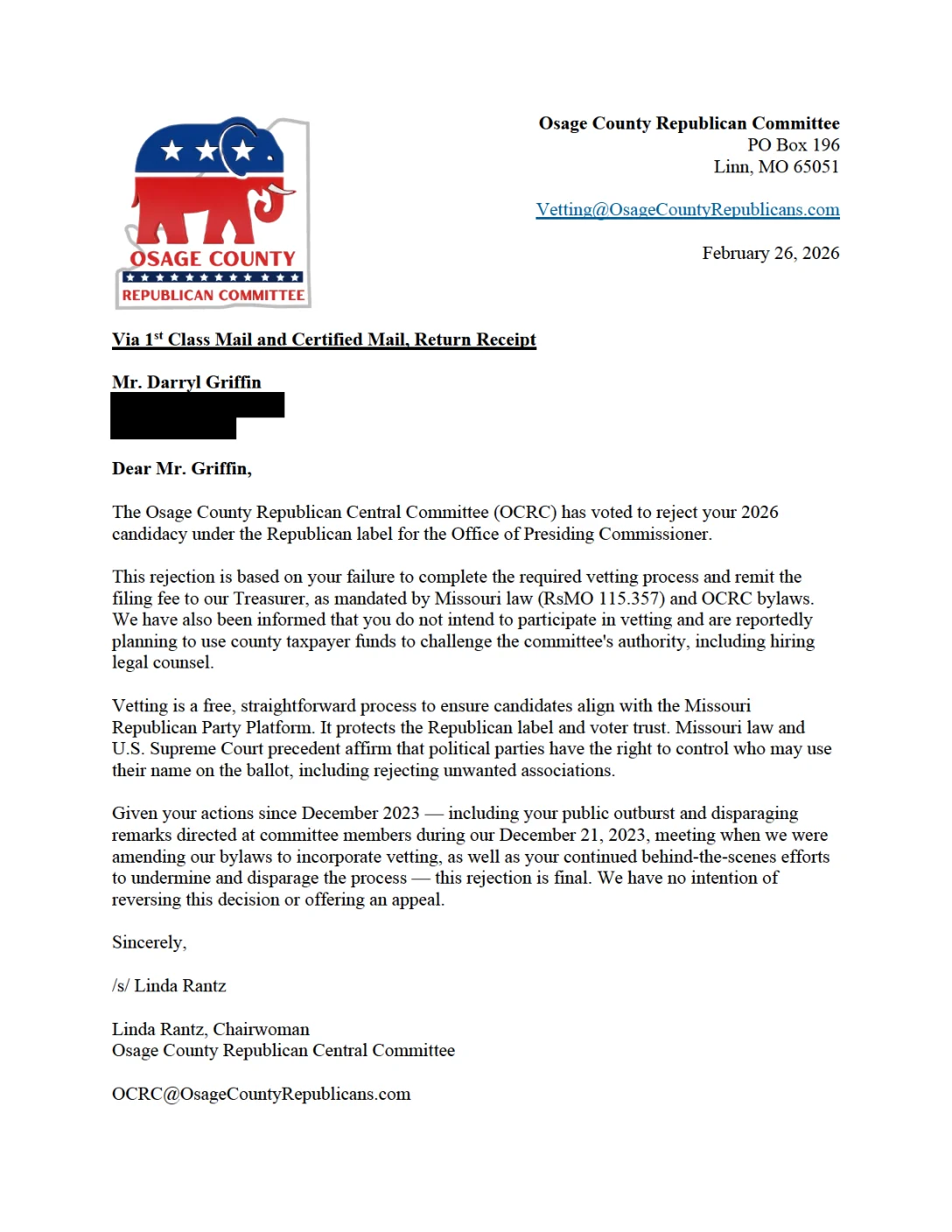 Official letter from the Osage County Republican Central Committee rejecting Presiding Commissioner Darryl Griffin’s 2026 candidacy under the Republican label. Sent certified mail to his home address on February 27, 2026.