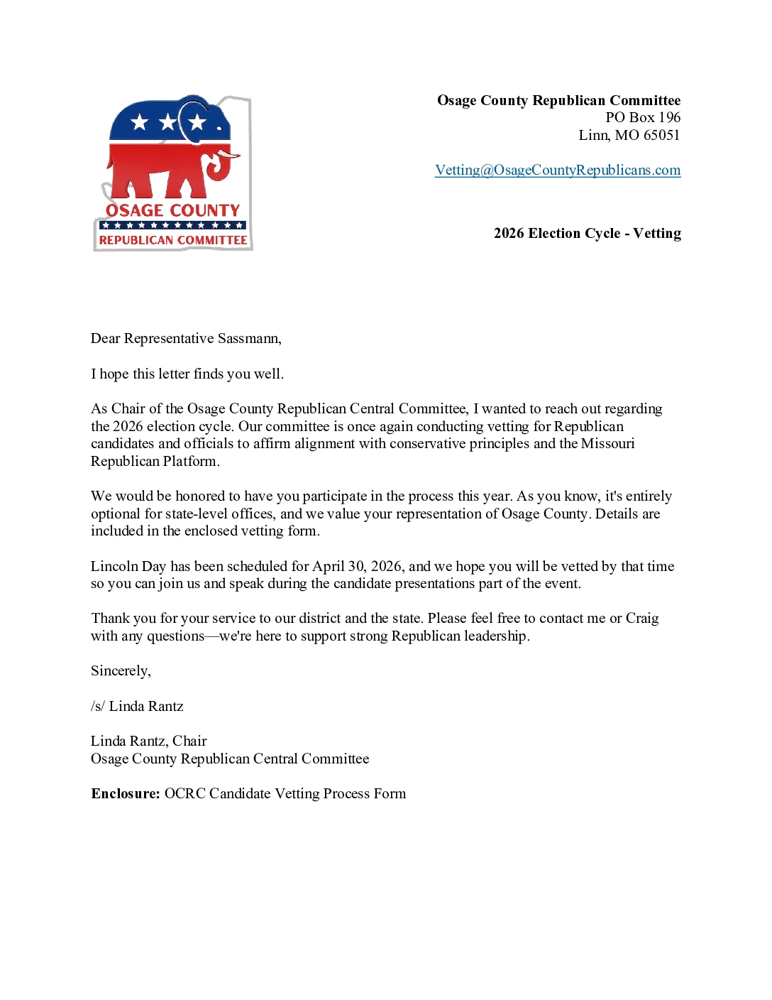 We would be honored to have you participate in the process this year. As you know, it’s entirely optional for state-level offices, and we value your representation of Osage County. Details are included in the enclosed vetting form.