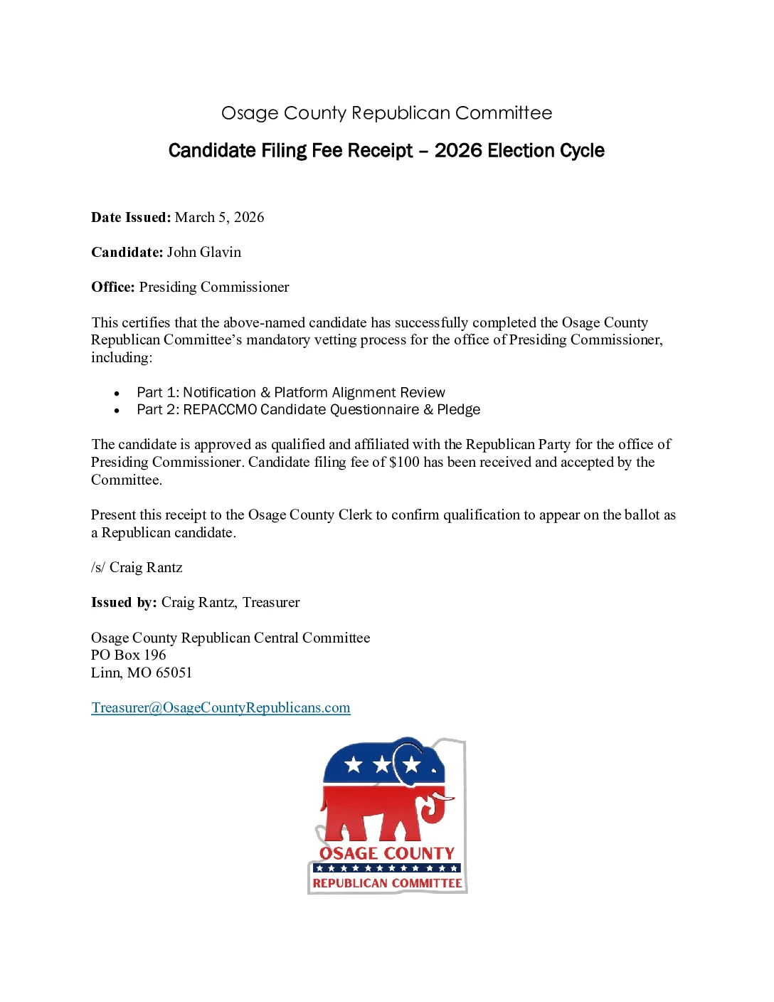 This receipt confirms John Glavin’s $100 filing fee payment on March 5, 2026, after successful vetting for Presiding Commissioner. It certifies completion of the two-part process, approval as qualified and affiliated with the Republican Party, and eligibility to appear on the ballot. Instructs presentation to the clerk. Payment considered complete upon deposit in the committee bank account.